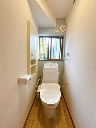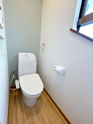【リフォーム完成】2階トイレのお写真です。新品交換しております。床はクッションフロア張替え、壁天井はクロス張替をいたしました。2階にトイレがあるのでわざわざ上り下りせずに済むのでうれしいですね。