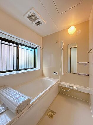 【リフォーム完成】浴室はリクシル製の新品のユニットバスに交換いたしました。浴槽には滑り止めの凹凸があり、床は濡れた状態でも滑りにくい加工がされている安心設計です。