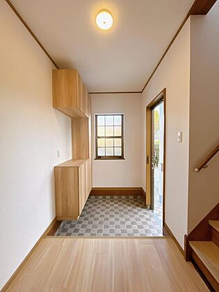 【リフォーム完成】玄関の壁天井はクロス張替を行い、シューズボックスは新品交換いたしました。照明も新品に交換しております。床はフロアタイルを張替えしております。おうちの顔である玄関が清潔感がるのはうれし