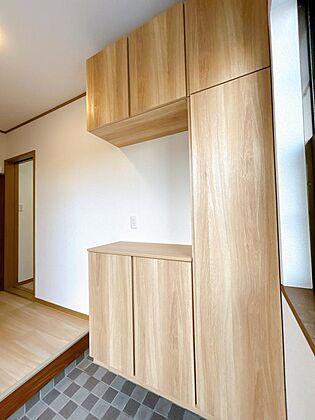 【リフォーム完成】玄関には新品のシューズボックスを新設いたしました。中の棚板は可動式ですので、様々なサイズに対応できます。