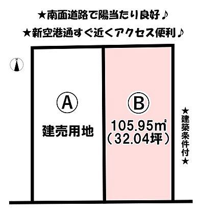 | 土地面積/坪(坪単価) | 105.95m2(実測)/32.11坪(37.40万円) | 代表的な接道 | 一方 私道 南 4m ※詳細は備考欄をご確認ください |