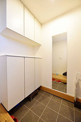 靴の収納に困らない玄関収納。鏡があるのでお出かけ前のチェックもぬかりなくできます!