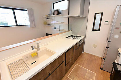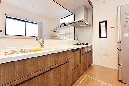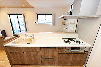 リビング全体を見渡せるオープンキッチン。食洗機が標準装備。大人が横並びでも十分なスペースがあるので、夫婦で料理も楽しめます。