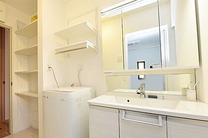 洗濯機上部の空間を有効利用したランドリーラック。洗面用具や物干用ハンガー等をスッキリ収納。