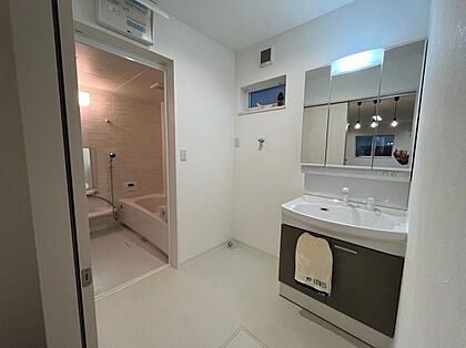 洗面所には3面鏡付きシャワーヘッド水栓の洗面化粧台。