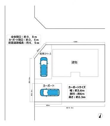 【区画図】【横づけ分拡張工事実施予定】お車2台駐車可能です。1台はカーポート付きです。2台お持ちでも、車の入れ替えをしなくて済むため便利ですね。高さもゆったりですので大型SUVでも安心です。
