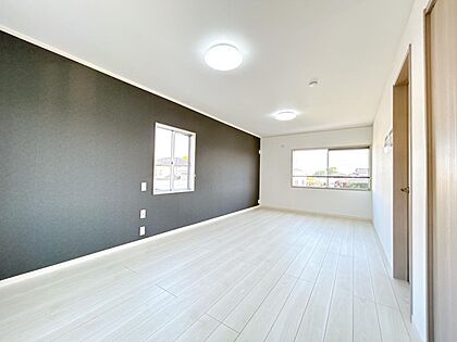 【リフォーム完成】2階約9帖の洋室別角度のお写真です。アクセントクロスが部屋の印象を引き締めます。