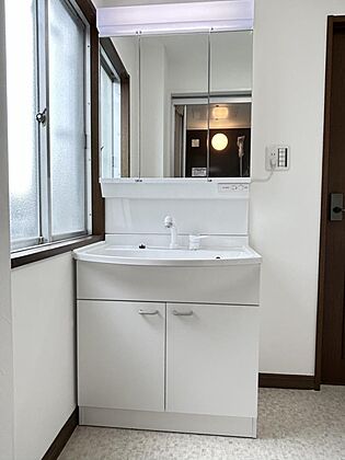 【リフォーム済】新品パナソニック製シャワー付き洗面化粧台を設置。便利な伸び縮みするシャワーヘッドに加え、三面鏡の中は、収納スペースで、整髪料などの小物も取り出しやすく散らかりません。