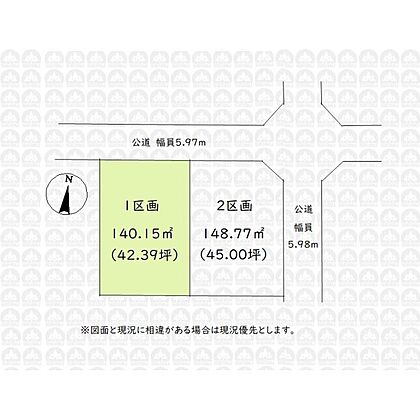 | 土地面積/坪(坪単価) | 140.15m2(実測)/42.47坪(32.50万円) | 代表的な接道 | 一方 公道 北 5.9m ※詳細は備考欄をご確認ください |
