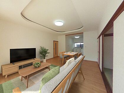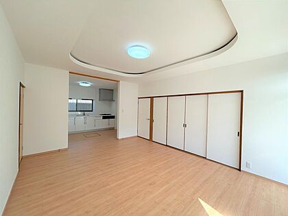 【リフォーム完成】LDKの別角度の写真です。床材交換・クロス張替え・照明交換等行っています。キッチンで作った料理を直線状に運んでいけるのは凄く便利ですよね。