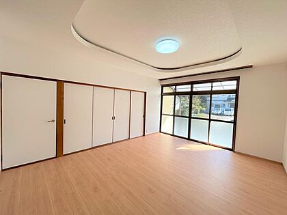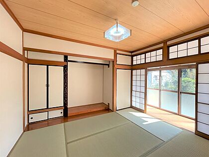 【リフォーム完成】1階和室の写真です。畳表替え・クロス張替え・照明交換等行っています。縁側からの日差しのぬくもりと畳の匂いでゆっくりとお昼寝が出来そうですね。