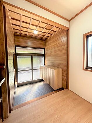 【リフォーム完成】玄関内部の別角度の写真です。床材交換やクロス張替え・照明交換等行っています。床材の交換を行ったことによって、木のぬくもりが感じられる玄関となりました。