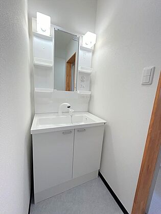 【リフォーム完成】洗面化粧台はハウステック製に新品交換しました。鏡横に棚が4つ付いているので散らかりがちな小物もスッキリ収納できますね