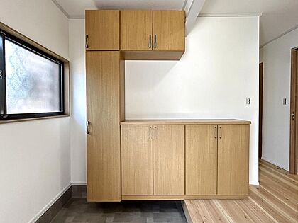 【リフォーム後 玄関】シューズボックスはクリーニング、建付け調整を行いました。大容量のシューズボックスです。