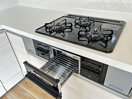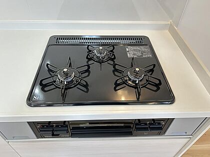 【ガスコンロ】コンロはうれしい3口。忙しい朝でも一度に調理できるので、時間短縮できます。