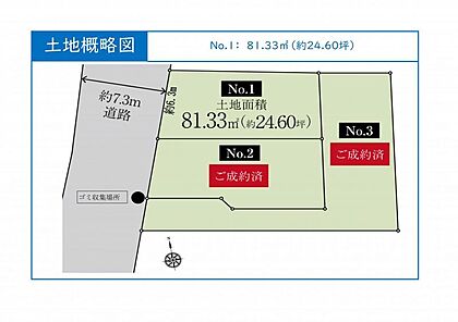 | 土地面積/坪(坪単価) | 81.33m2(登記簿)/24.65坪(283.20万円) | 代表的な接道 | 一方 公道 西 6.3m ※詳細は備考欄をご確認ください |