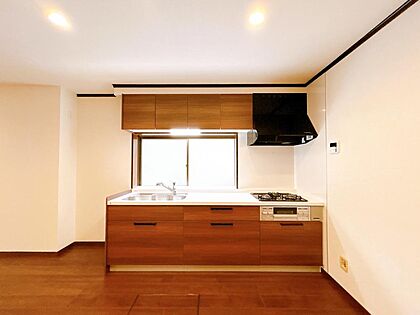 【リフォーム済】キッチンは新品に交換を行いました。約255cmの広さでお料理がはかどります。キッチン背面には冷蔵庫・食器棚を置くスペースがあります。