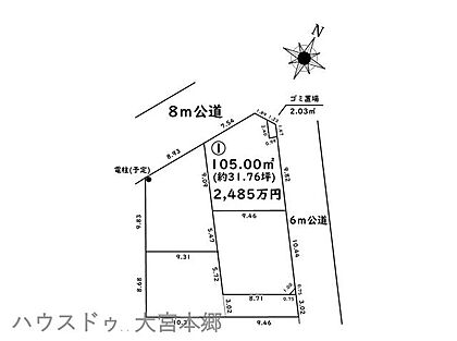 | 土地面積/坪(坪単価) | 105.00m2/31.82坪(75.00万円) | 代表的な接道 | 角地 公道 北東 6m、北西 8m ※詳細は備考欄をご確認ください |
