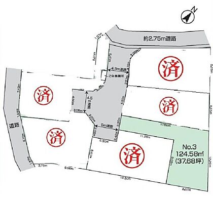 | 土地面積/坪(坪単価) | 124.58m2(実測)/37.75坪(31.50万円) | 代表的な接道 | 一方 公道 南西 4.5m ※詳細は備考欄をご確認ください |