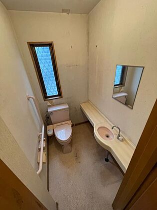 手洗スペースを設けたトイレ。一面棚付きは芳香剤なども置けて便利ですね。