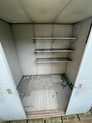 奥行もしっかりとれた物置。タイヤやゴルフグッズ等幅のあるものから高さあるものまで収納可能。