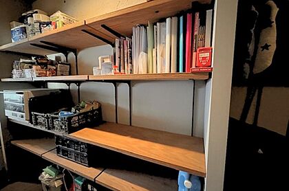 キッチン背面には可動式の棚もあり、レシピ本やストック品を置くこともできます。
