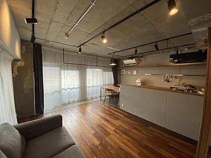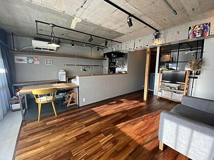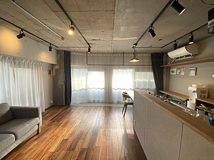 暖かい色味と木目のナチュラルな床材・棚板と、荒っぽいコンクリートの天井が、巧みにマッチした空間です。