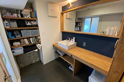 洗面スペースは、広いカウンターが設けられ、二人並んでも快適に作業ができるスペースが確保されています。