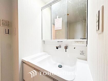 洗面台には三面鏡を採用。身だしなみを整えやすい事はもちろんですが、鏡の後ろに収納スペースを設ける事により、散らかりやすい洗面スペースをすっきりさせる事が出来るのも嬉しいですね。