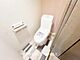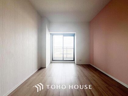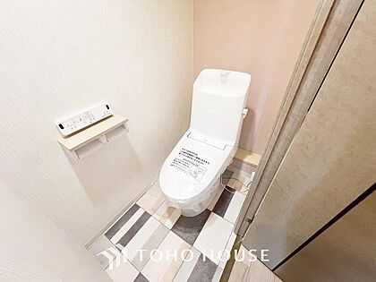 手洗い一体型のトイレには、ピンク色のアクセントクロスと、デザイン性溢れる床が、快適かつお洒落さを演出。いつも清潔な空間であるように。
