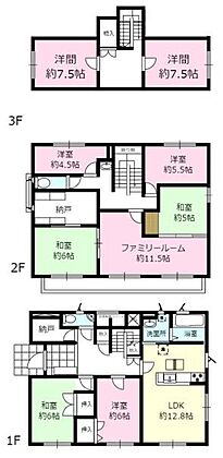 2世帯住宅にも最適な部屋数たっぷり9SLDKの3階建て!2か所の納戸、そしてその他収納スペースも充実しているので、住空間はスッキリ広々◎水回り集中設計の家事動線が考えられた使いやすい間取です◎