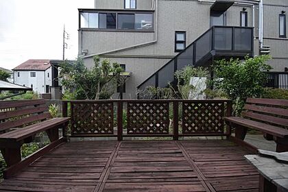 リビングからつながるウッドデッキ。広々としていて家族みんなで食事も◎