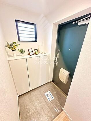 家の第一印象を決めるエントランスはいつもキレイにしておきたいもの。そこで玄関には収納力の高いシューズボックスを完備しました!写真のようにカウンター部分にお花や小物を飾ってもいいですね。