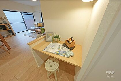 リビングカウンターお子様の勉強スペースや在宅ワークスペース、ダイニングテーブル上の荷物を一時的によけておく際にも使えます。カウンター横部分にはコンセントがございます。