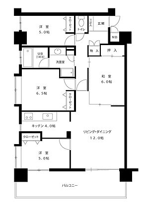 バルコニーが南東向き。南東と南西の2方向開口部がある角住戸