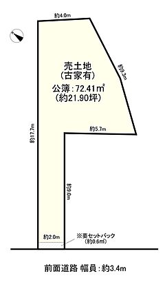 | 土地面積/坪(坪単価) | 72.41m2(登記簿)/21.94坪(40.10万円) | 代表的な接道 | 一方 公道 南西 3.4m ※詳細は備考欄をご確認ください |