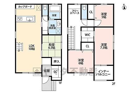 4.5帖の和室含む4LDK。玄関にシューズクローク付き。LDK18帖^^家族のコミュニケーションがとりやすいリビング階段。2階ホールにフリースペースあり^^全居室収納。南面インナーバルコニー^^