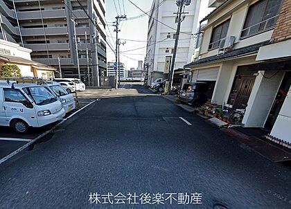 東側道路。国道沿い、整備された歩道があり安心。車がなくても生活できる環境立地です。