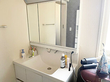 三面鏡の裏側には収納棚を確保。スキンケア用品やヘアケア用品などをすっきり整理できます。