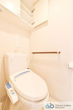 白を基調とした清潔感のあるトイレ。上部に収納もついておりますので、とても便利です。