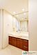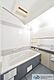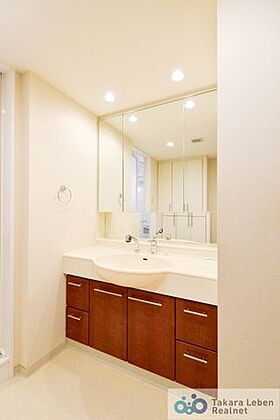 鏡で朝の身だしなみもくまなくチェック。清潔感溢れるスタイリッシュなデザインの洗面化粧台。