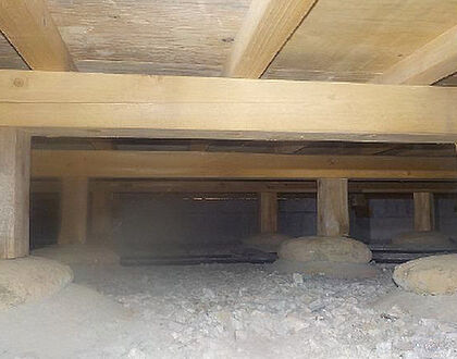 床下写真。中古住宅の3大リスクである、雨漏り、主要構造部分の欠陥や腐食、給排水管の漏水や故障を2年間保証します。その前提で床下まで確認の上でリフォームし、シロアリの被害調査と防除工事も行いました。