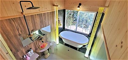 ウッドデッキ横に増設された浴室です。お洒落なバスタブが魅力。
