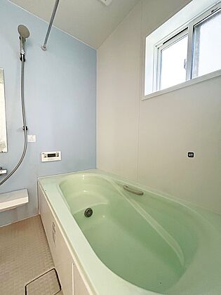■窓付きの浴室。ゆっくり足を伸ばして入浴できるサイズです♪