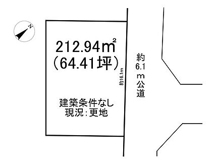 | 土地面積/坪(坪単価) | 212.94m2(登記簿)/64.53坪(6.20万円) | 代表的な接道 | 公道 北東 6.1m ※詳細は備考欄をご確認ください |
