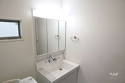 洗面室シンク下にもにしっかりと収納が確保されています。またコップなどを置いておけるスペースもございます。