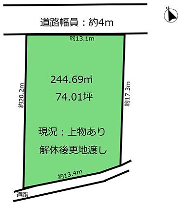 | 土地面積/坪(坪単価) | 244.69m2(登記簿)/74.15坪(9.40万円) | 代表的な接道 | 一方 公道 北東 4m ※詳細は備考欄をご確認ください |
