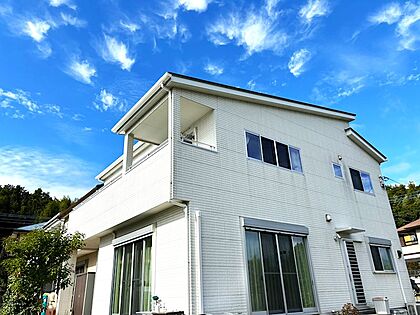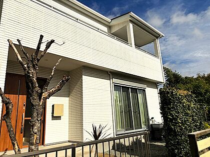 【爽やかな白基調の外観】高台の立地に建ち、開放感がある一戸建てです。