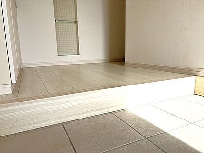 【ここから室内のご紹介】白基調の明るい玄関です。正面にはお気に入りのオブジェクトを飾れる仕様です。