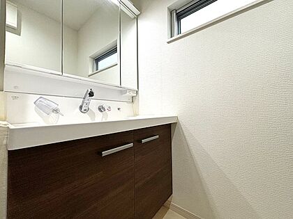【洗面脱衣室】洗濯機置場が併設された清潔感のある洗面室です。